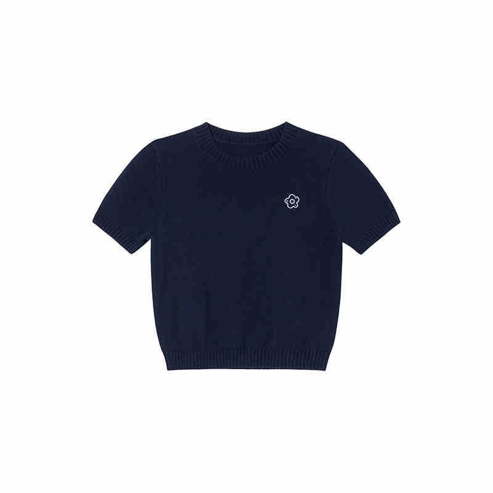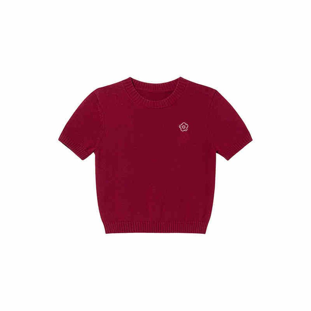 Women's Flower Embroidery Straight Shoulder Knitted Short-Sleeved Sweater